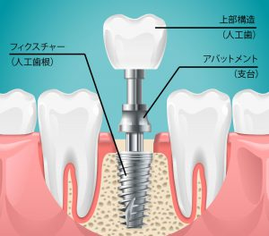 インプラントの仕組みは、歯肉の下の骨に埋め込み歯根の働きをする「人工歯根(フィクスチャー)」と、歯肉の上に見える歯「上部構造」、その2つをつなぐ「アバットメント」の3パーツから構成されています。