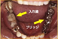 ブリッジ:失われた歯を、前後の歯に固定して使用するもの。