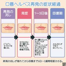 口唇ヘルペスは、単純ヘルペスウイルスが原因で、口唇に水疱ができる病気です。症状は、時間とともに変化します。初期段階として水疱出現前にヒリヒリした感じ、掻痒(そうよう)感、熱感などを感じます。その後水疱が出現し融合して大きくなります。時間がたつと水疱がやぶれて、かさぶたになり治癒していきます。