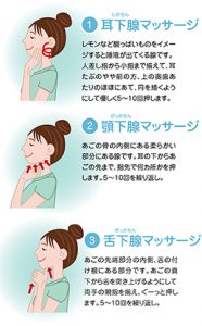 ・軽い運動を行い、人と会話をする。ストレスを解消することにより唾液腺も刺激する。