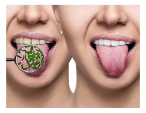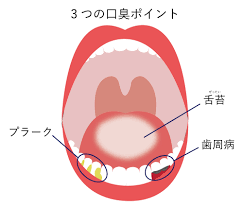 舌苔とは舌に付着した白っぽい汚れで、口臭を引き起こす細菌やたんぱく質を大量に含んでいます。舌苔は胃腸の調子が良くないときに増えやすいです。