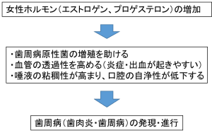女性ホルモンの分泌が急増するため、歯肉炎の発症がみられやすくなる。妊娠性歯肉炎は妊婦の30~70%に発症する