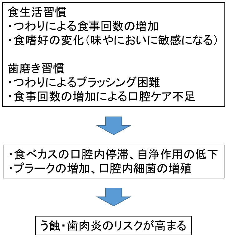 お腹が大きくなって子宮が肺や胃を圧迫するため一回の食事量が少なくなり、食事回数が増える。それにより口腔ケアが不十分になり、口腔内の酸性化も起こりやすく、歯肉炎や齲蝕の進行が危惧される。