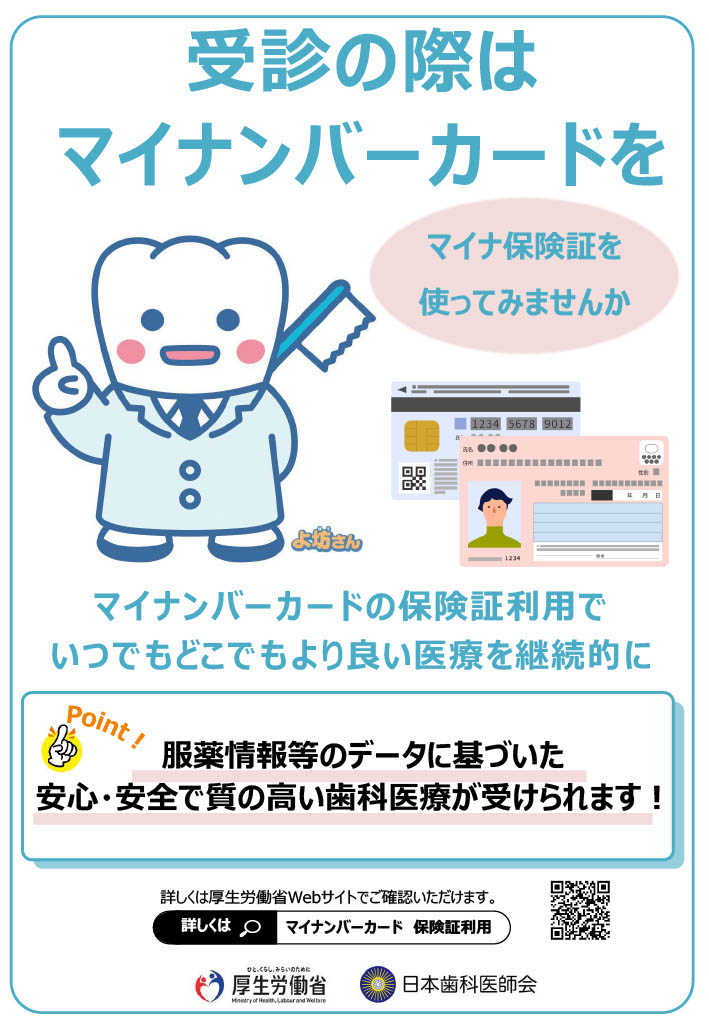 当医院では、オンライン資格確認システムを導入しており、マイナンバーカードが健康保険証として利用できます。患者さんの薬剤情報等の診療情報を取得・活用して、質の高い医療提供に努めています。マイナ保険証の利用にご協力ください。
